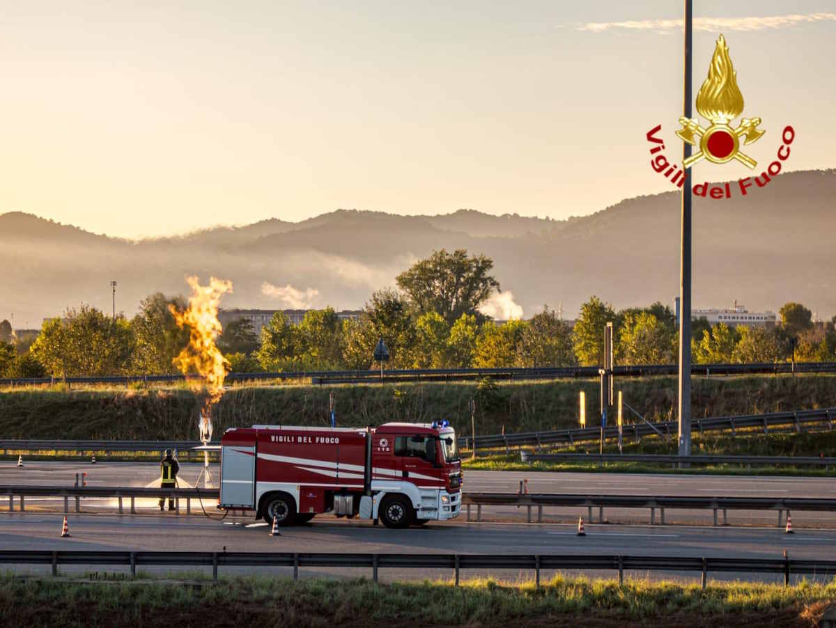 Lo svincolo è stato chiuso al traffico veicolare e si sono formate lunghe code. I Vigili del Fuoco stanno procedendo alla messa in sicurezza con successiva bonifica in torcia.